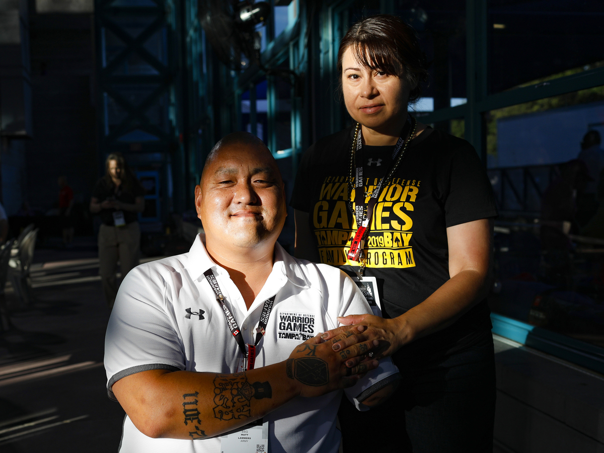 Retired Staff Sgt. Matt Lammers holds the hand of his wife, Alicia.