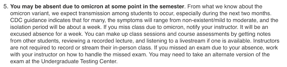 Translation: You will very likely get COVID-19 this semester and have to miss class, but professors are not required to stream or record their lectures. Let’s hope you have friends in your classes, or else your GPA is going to drop faster than you can say the word “omicron.”
